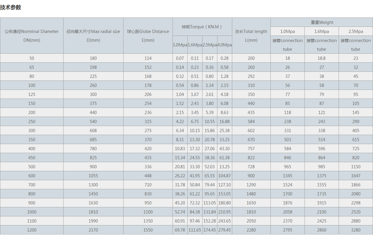 公稱通徑Norminal Diameter DN(mm) | 徑向很大尺寸Max radial size D(mm) | 球心距Globe Distance E(mm) | 轉(zhuǎn)矩Torque(KN.M) | 總長Total length L(mm) | 重量Weight | |||||