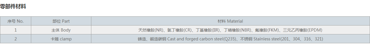 1 | 主體 Body | 天然橡膠(NR)、氯丁橡膠(CR)、丁基橡膠(IIR)、丁晴橡膠(NBR)、氟橡膠(FKM)、三元乙丙橡膠(EPDM) |