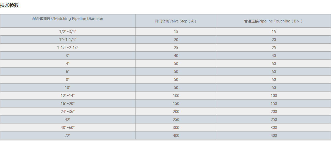配合管道通徑Matching Pipeline Diameter | 閥門臺階Valve Step(A) | 管道連接Pipeline Touching(B>) |