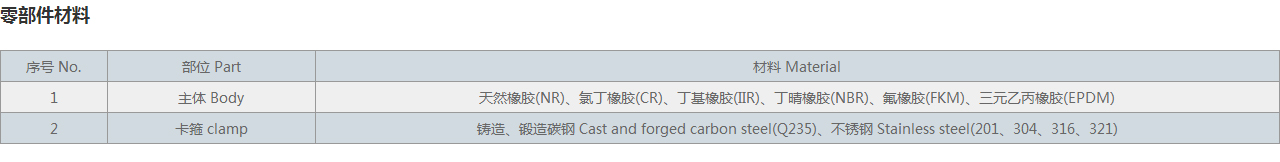 1 | 主體 Body | 天然橡膠(NR)、氯丁橡膠(CR)、丁基橡膠(IIR)、丁晴橡膠(NBR)、氟橡膠(FKM)、三元乙丙橡膠(EPDM) |