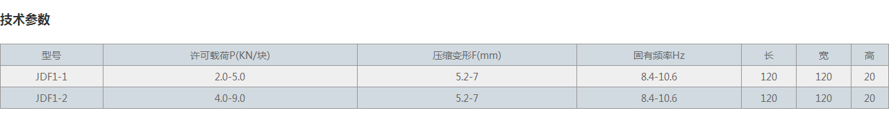 型號 | 許可載荷P(KN/塊) | 壓縮變形F(mm) | 固有頻率Hz | 長 | 寬 | 高 |