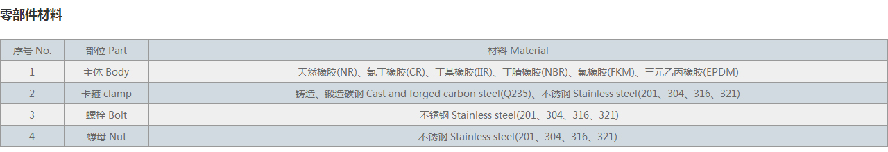 1 | 主體 Body | 天然橡膠(NR)、氯丁橡膠(CR)、丁基橡膠(IIR)、丁腈橡膠(NBR)、氟橡膠(FKM)、三元乙丙橡膠(EPDM) |