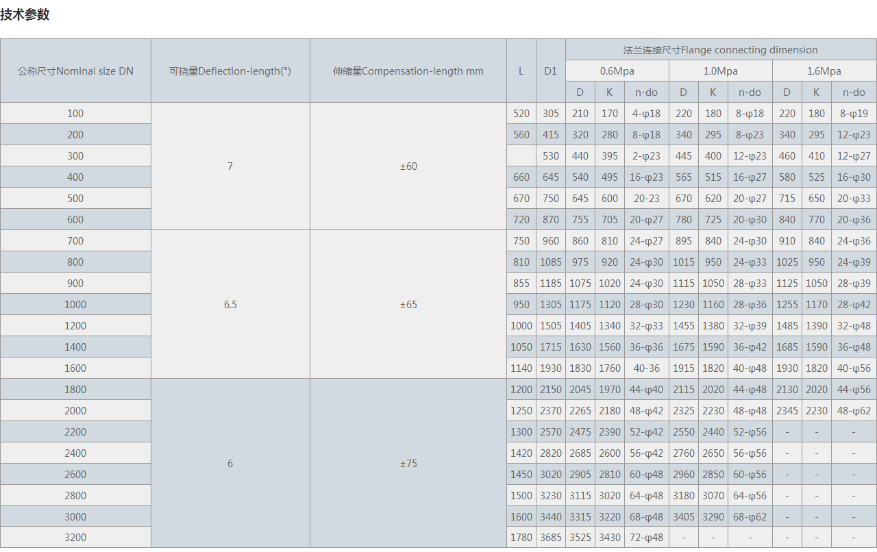 可撓量Deflection-length(°) | 伸縮量Compensation-length mm | L | D1 | 法蘭連接尺寸Flange connecting dimension | ||||||||