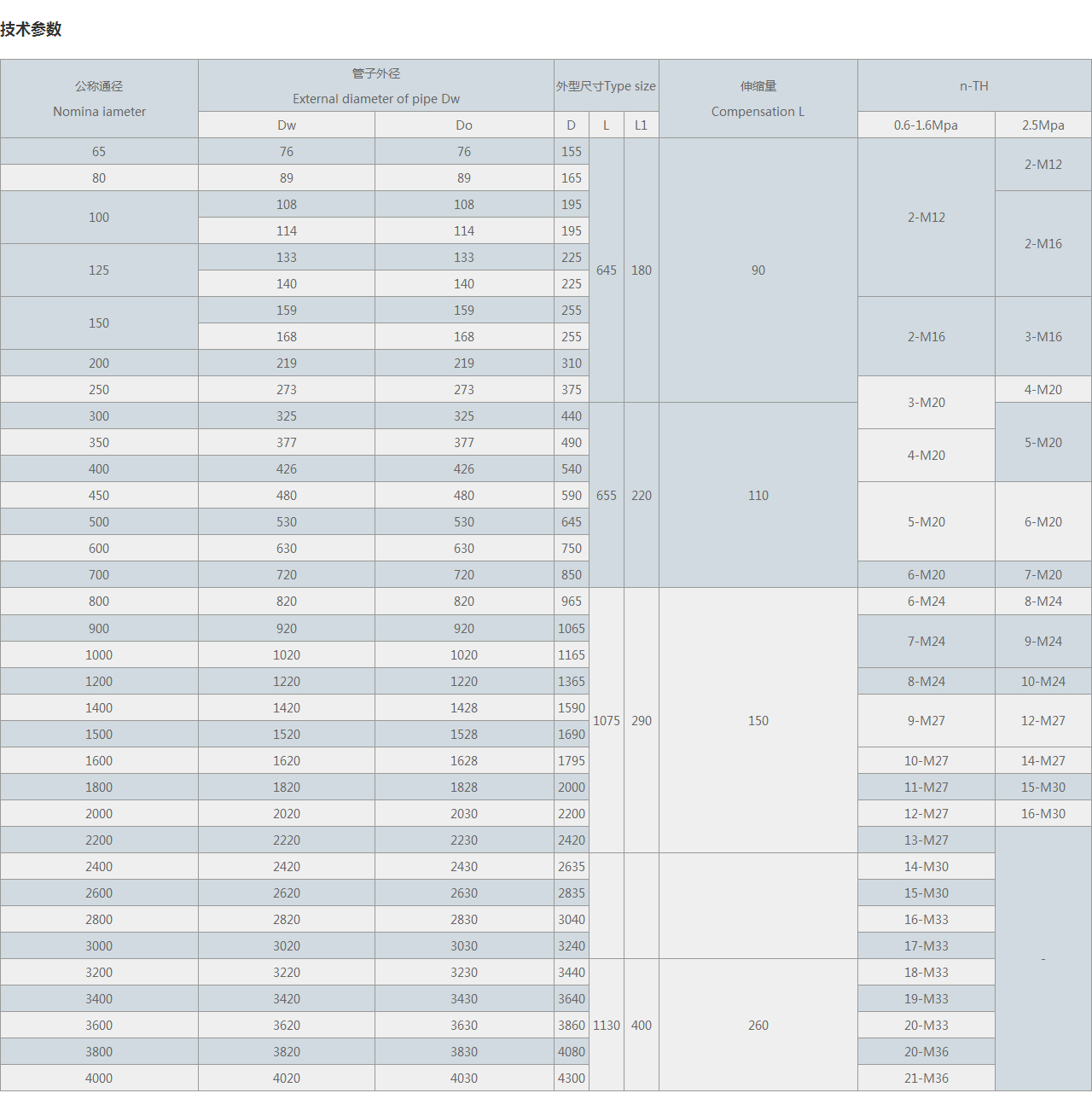 Dw | Do | D | L | L1 | 0.6-1.6Mpa | 2.5Mpa | |||