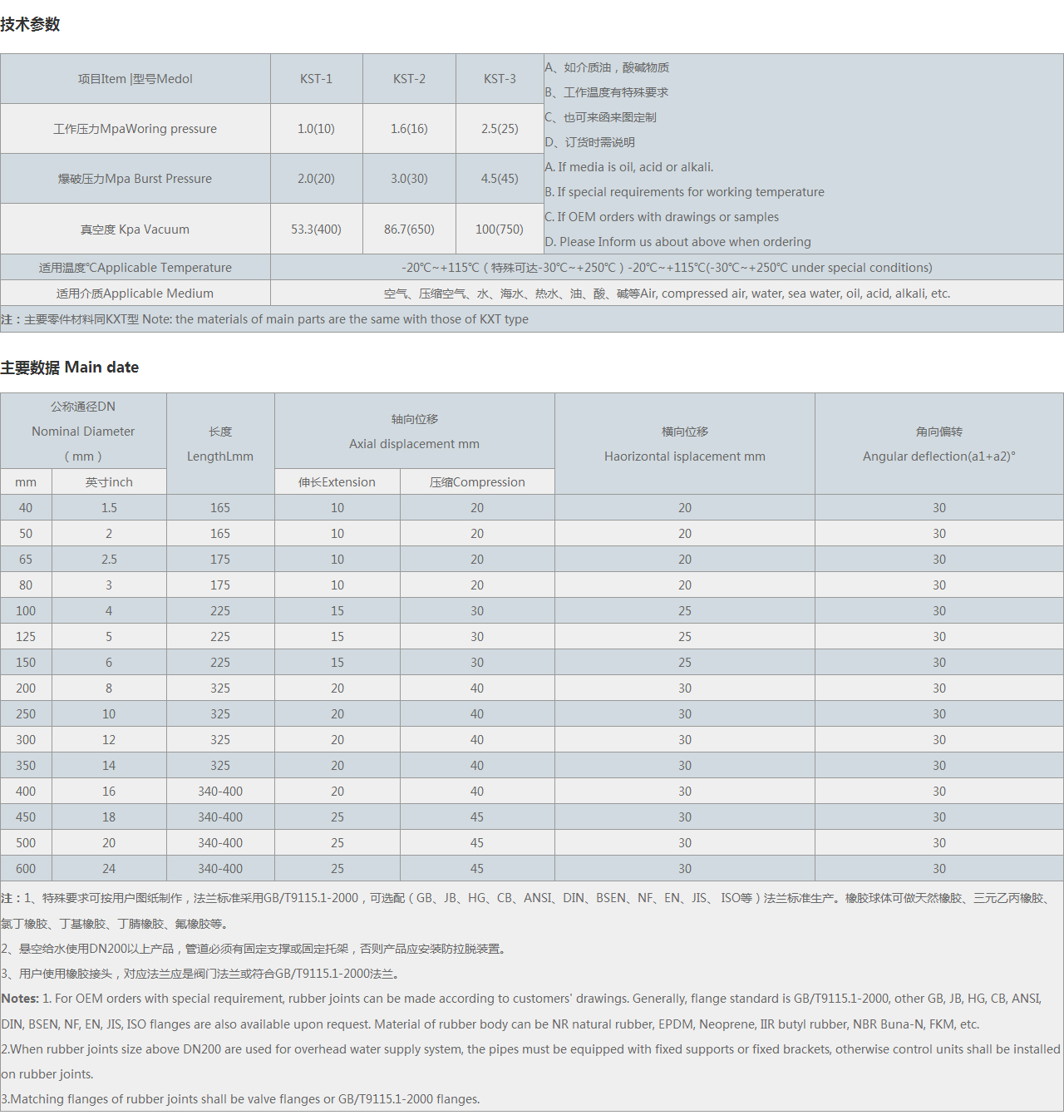 注:1、特殊要求可按用戶圖紙制作,可選配(GB、JB、HG、CB、ANSI、DIN、BSEN、NF、EN、JIS、 等)法蘭標準生產。橡膠球體可做天然橡膠、三元乙丙橡膠、氯丁橡膠、丁基橡膠、丁腈橡膠、氟橡膠等。 2、懸空給水使用DN200以上產品,管道必須有固定支撐或固定托架,否則產品應安裝防拉脫裝置。 3、用戶使用橡膠接頭,對應法蘭應是閥門法蘭。 Notes: 1. For OEM orders with special requirement, rubber joints can be made according to customers' drawings. Generally, flange standard is , other GB, JB, HG, CB, ANSI, DIN, BSEN, NF, EN, JIS, flanges are also available upon request. Material of rubber body can be NR natural rubber, EPDM, Neoprene, IIR butyl rubber, NBR Buna-N, FKM, etc. 2.When rubber joints size above DN200 are used for overhead water supply system, the pipes must be equipped with fixed supports or fixed brackets, otherwise control units shall be installed on rubber joints. 3.Matching flanges of rubber joints shall be valve flanges or flanges. |