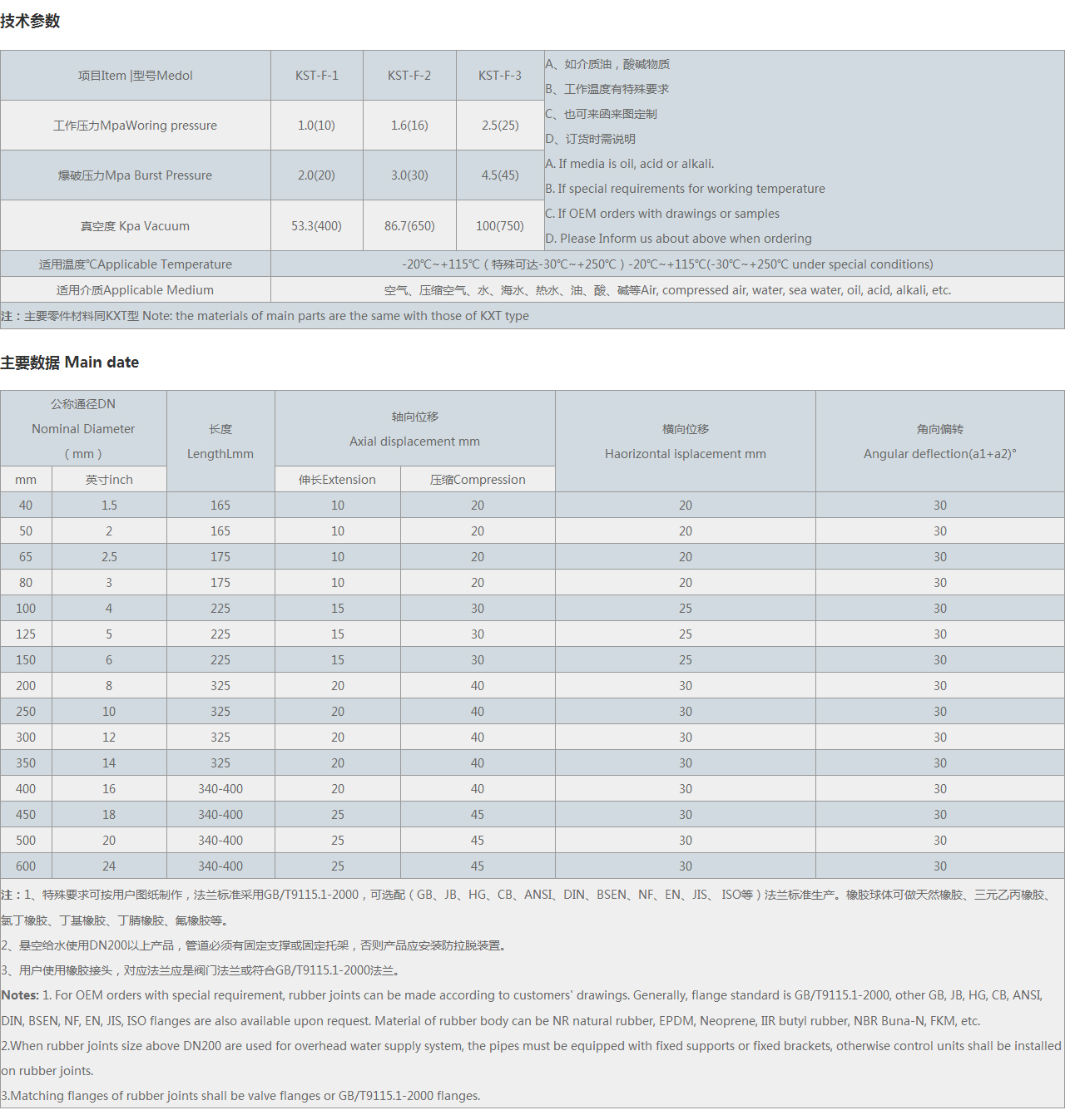注:1、特殊要求可按用戶圖紙制作,可選配(GB、JB、HG、CB、ANSI、DIN、BSEN、NF、EN、JIS、 等)法蘭標準生產。橡膠球體可做天然橡膠、三元乙丙橡膠、氯丁橡膠、丁基橡膠、丁腈橡膠、氟橡膠等。 2、懸空給水使用DN200以上產品,管道必須有固定支撐或固定托架,否則產品應安裝防拉脫裝置。 3、用戶使用橡膠接頭,對應法蘭應是閥門法蘭。 Notes: 1. For OEM orders with special requirement, rubber joints can be made according to customers' drawings. Generally, flange standard is , other GB, JB, HG, CB, ANSI, DIN, BSEN, NF, EN, JIS, flanges are also available upon request. Material of rubber body can be NR natural rubber, EPDM, Neoprene, IIR butyl rubber, NBR Buna-N, FKM, etc. 2.When rubber joints size above DN200 are used for overhead water supply system, the pipes must be equipped with fixed supports or fixed brackets, otherwise control units shall be installed on rubber joints. 3.Matching flanges of rubber joints shall be valve flanges or flanges. |